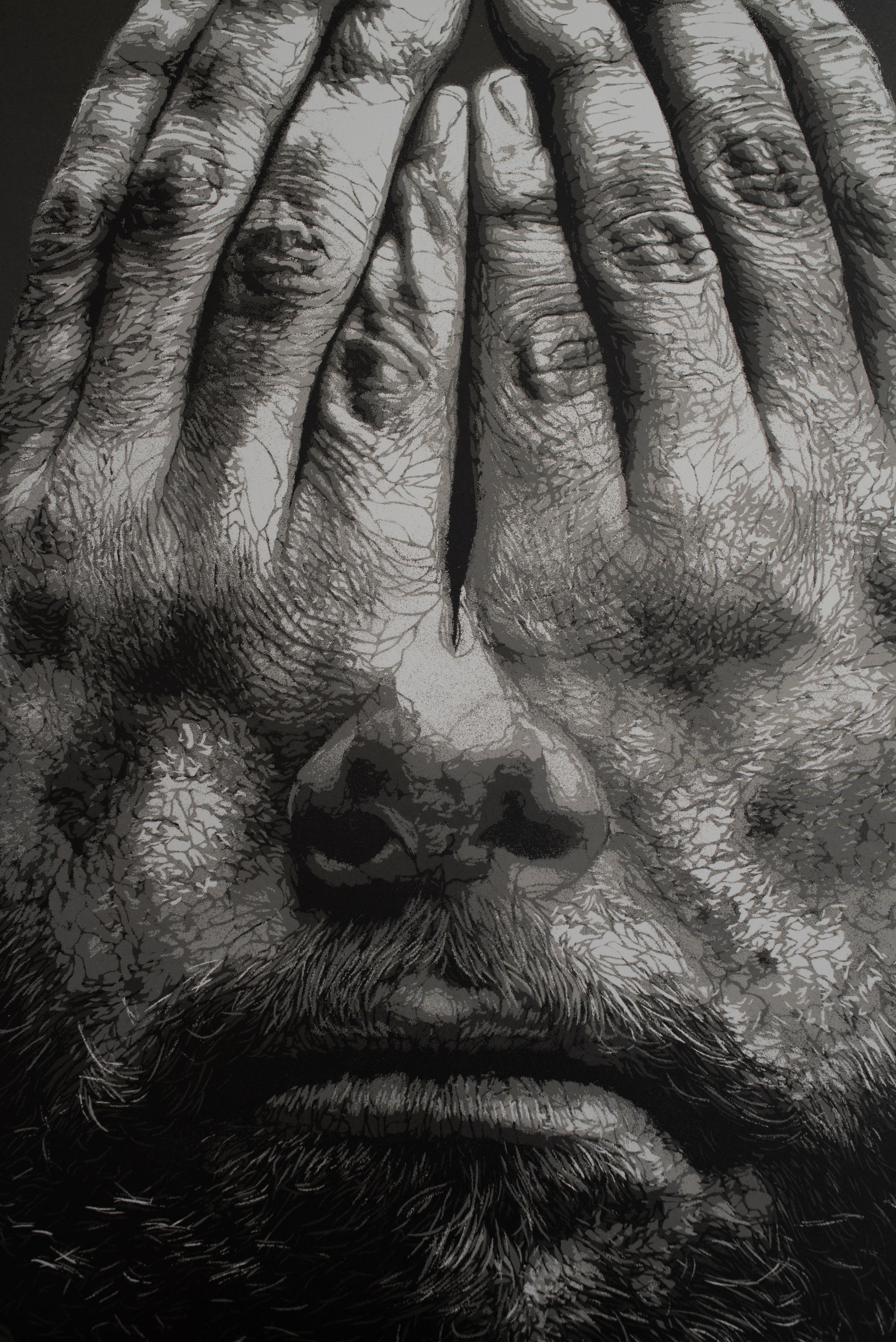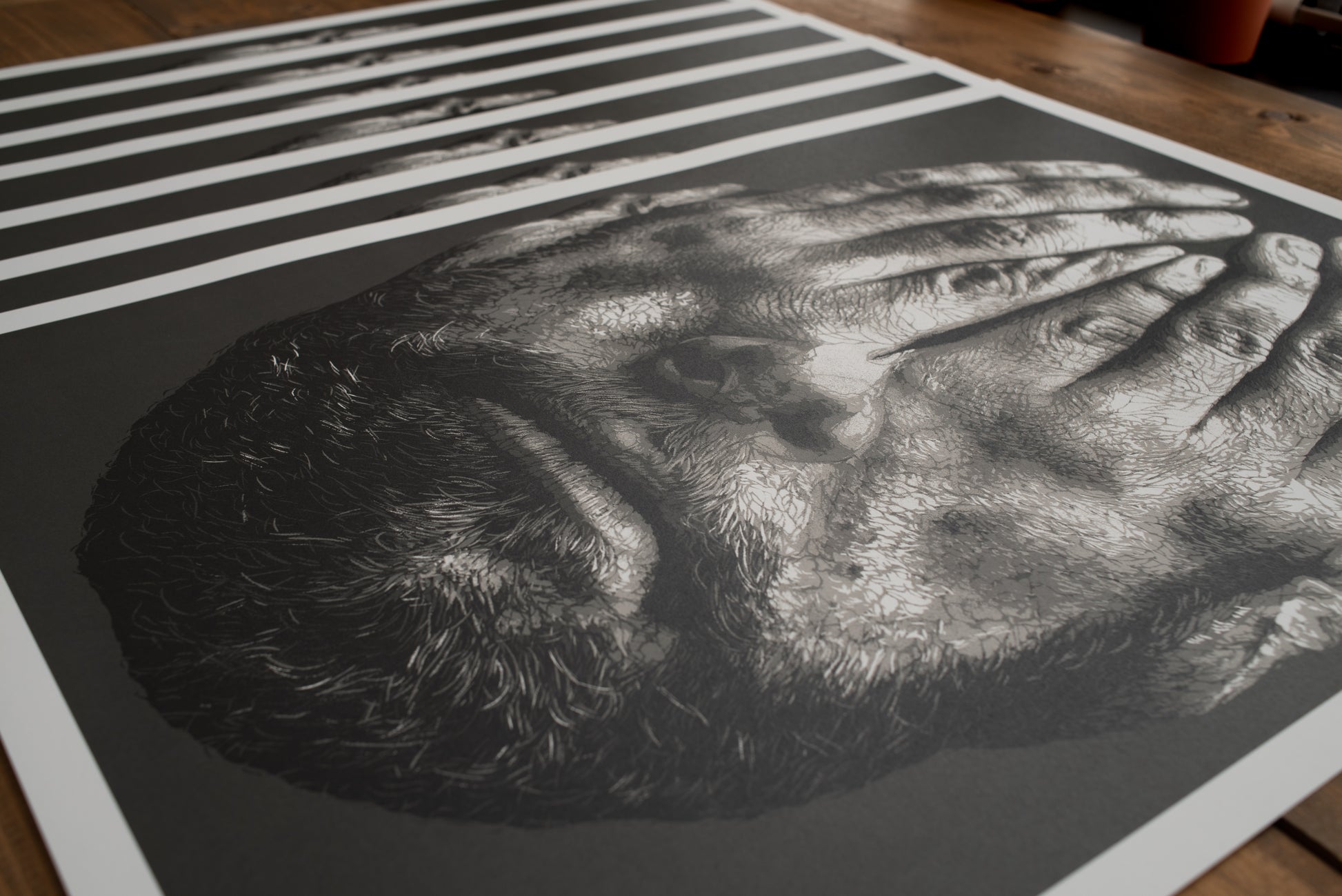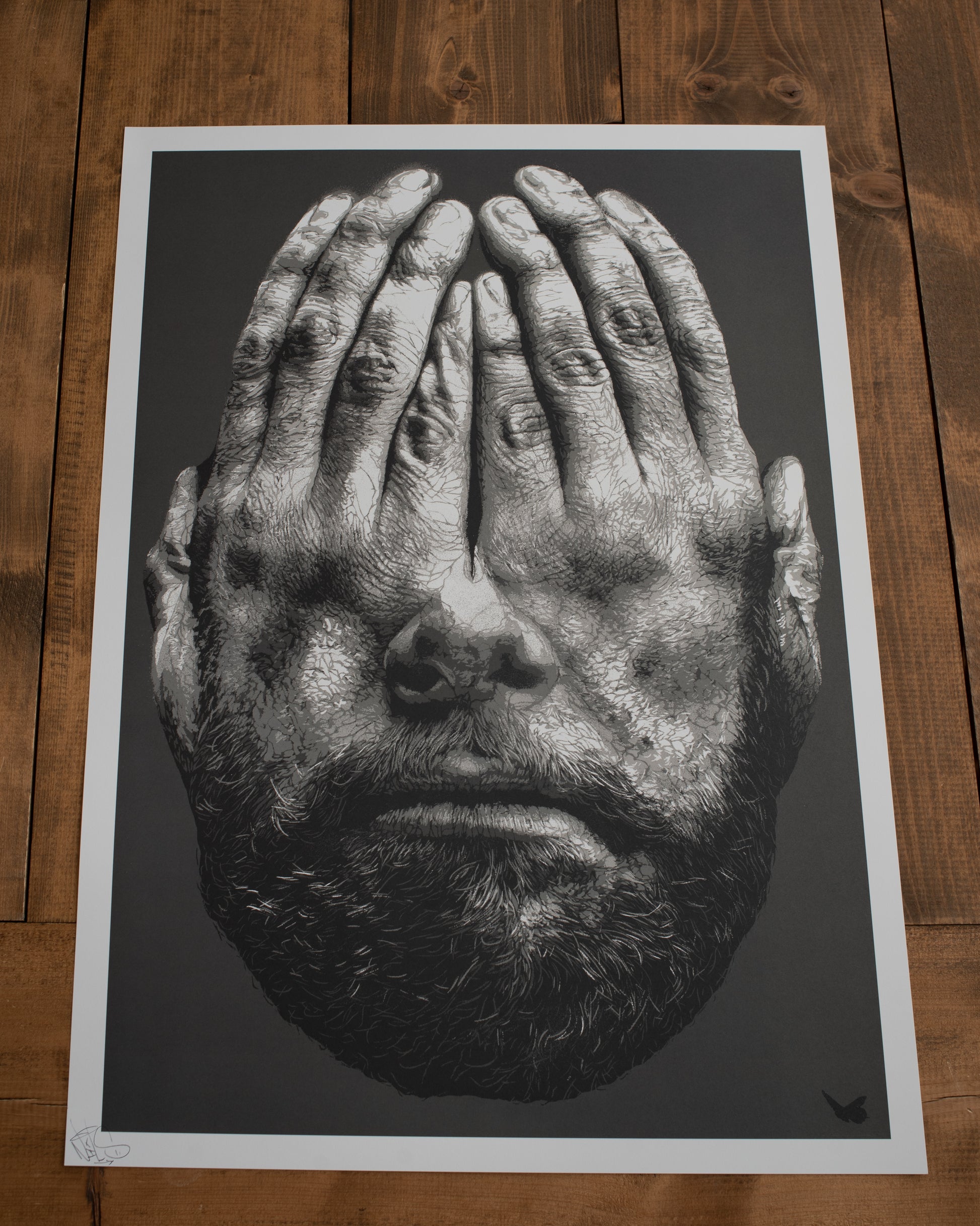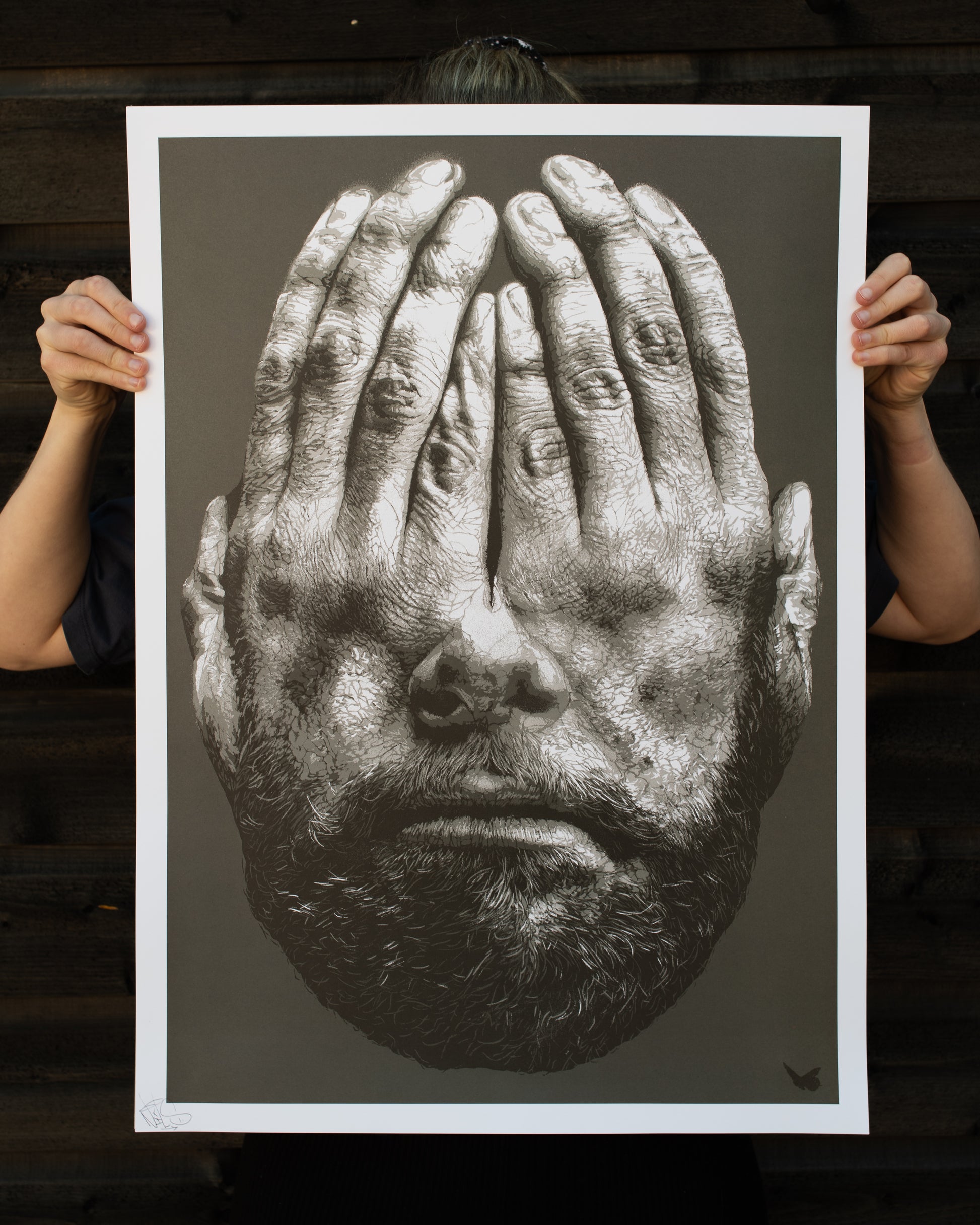 "Beholden" capture un sentiment d'obligation et de gratitude, symbolisé par les deux mains jointes du sujet recouvrant ses yeux, signifiant à la fois la reconnaissance et la vulnérabilité. La fusion harmonieuse des mains et du visage de Nils crée une métaphore visuelle de la nature interdépendante des relations humaines. Cette œuvre invite à méditer sur l'essence de la gratitude et sur l'interconnexion de notre existence. Ce pochoir magistral de NILS.RVA ajoute profondeur et beauté à l'œuvre, évoquant une réponse émotionnelle profonde. Sa nature poétique et son exécution captivante garantissent qu'elle laisse une impression durable sur qui la regarde.