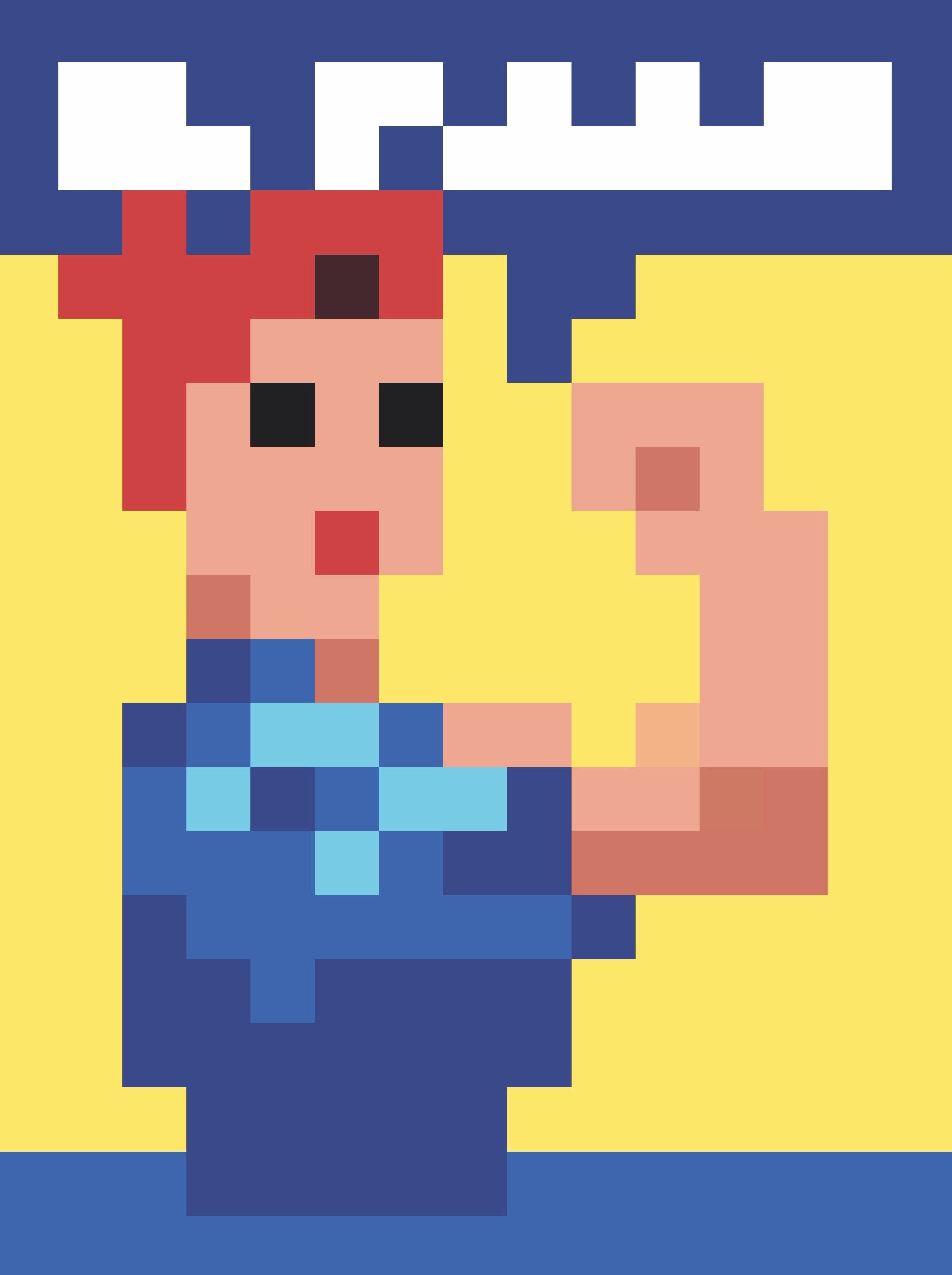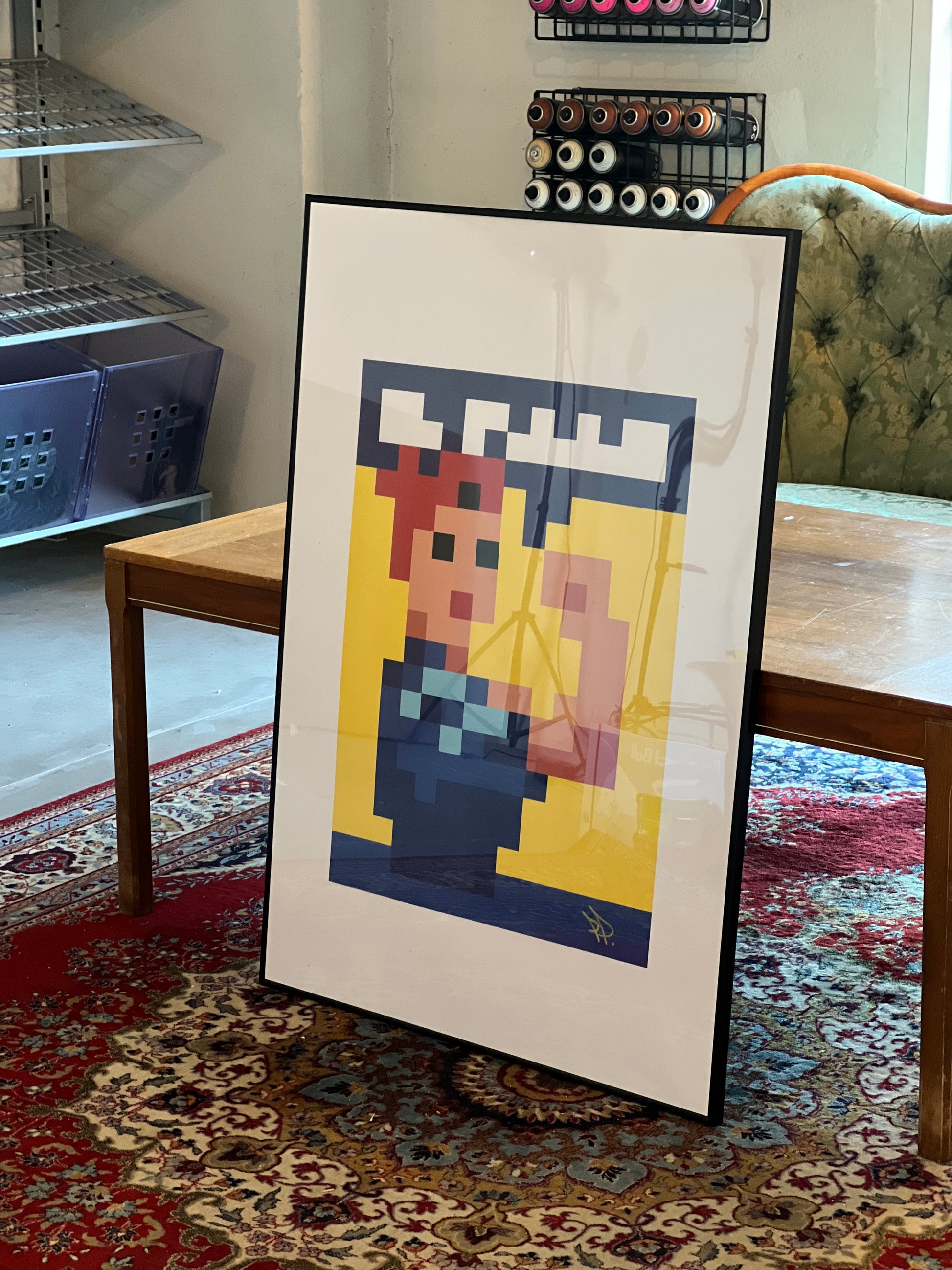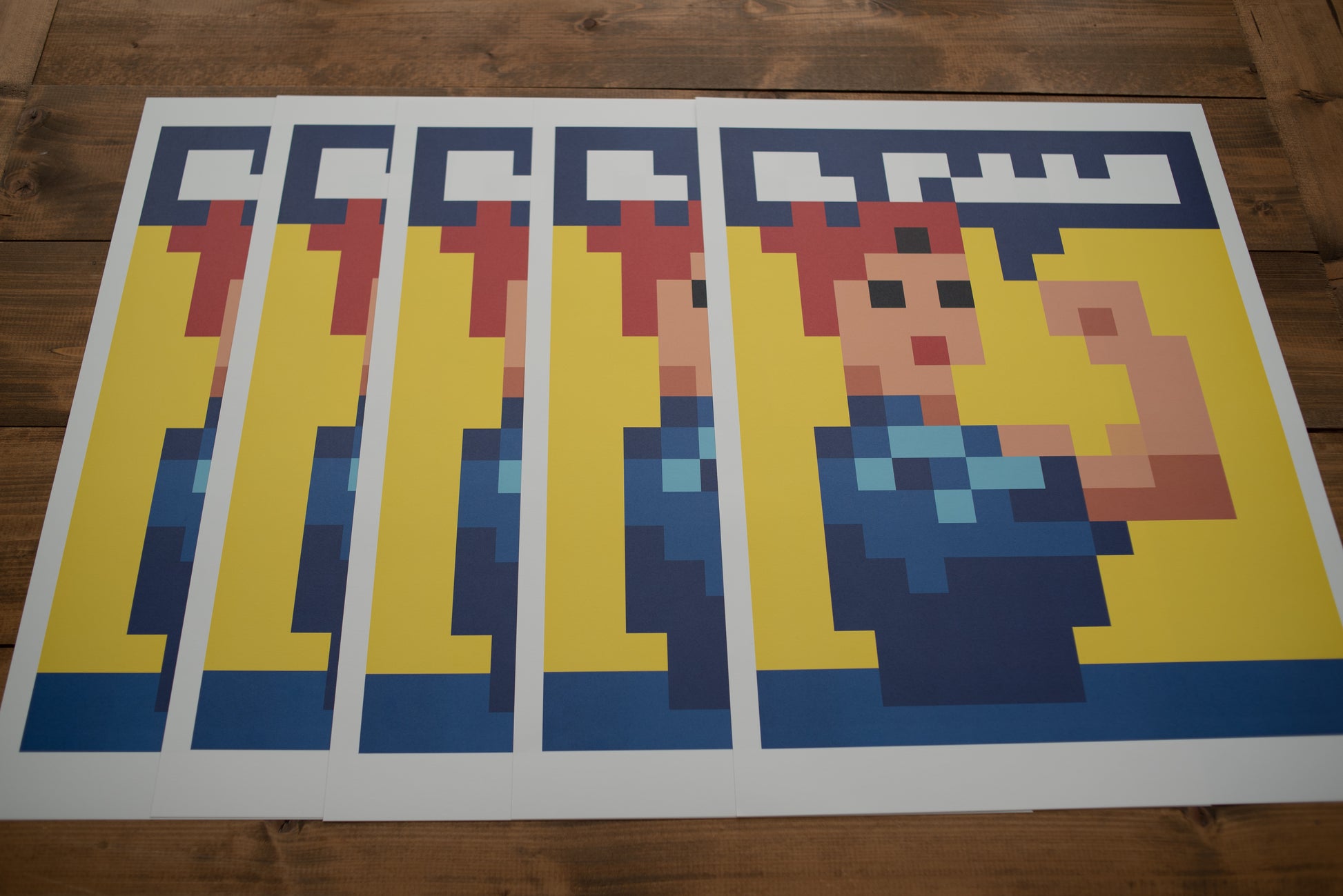 Pappas Pärlor interprete et transpose l'affiche emblématique 'We Can Do It!' dans le graphisme minimaliste de 15 x 32 pixels par 64RGB, qu'il agrandi ensuite en format 70 x 50 cm. Créée à l'origine par J. Howard Miller en 1943 pour Westinghouse Electric, afin de stimuler le moral des travailleuses, l'image a gagné en importance dans les années 1980 et a depuis été largement reproduite pour promouvoir le féminisme et d'autres questions politiques. Cette réinterprétation offre une perspective unique et puissante sur l'image emblématique, célébrant son rôle dans la culture populaire et son impact sur l'égalité des sexes. Ludique mais audacieuse, cette œuvre d'art ne manquera pas d'inspirer et définir votre style personnel dans n'importe quel intérieur.