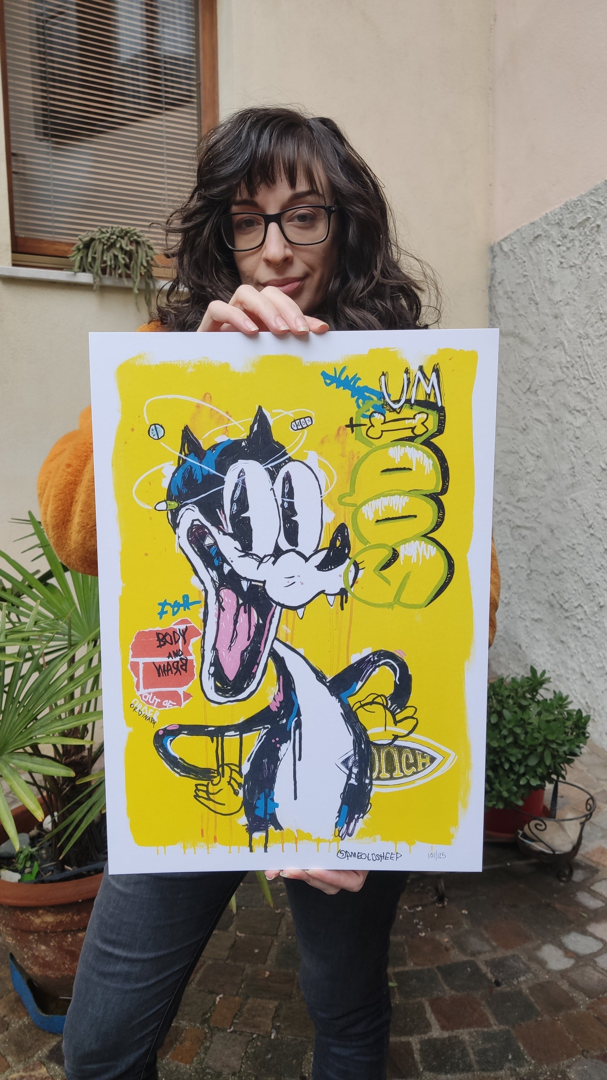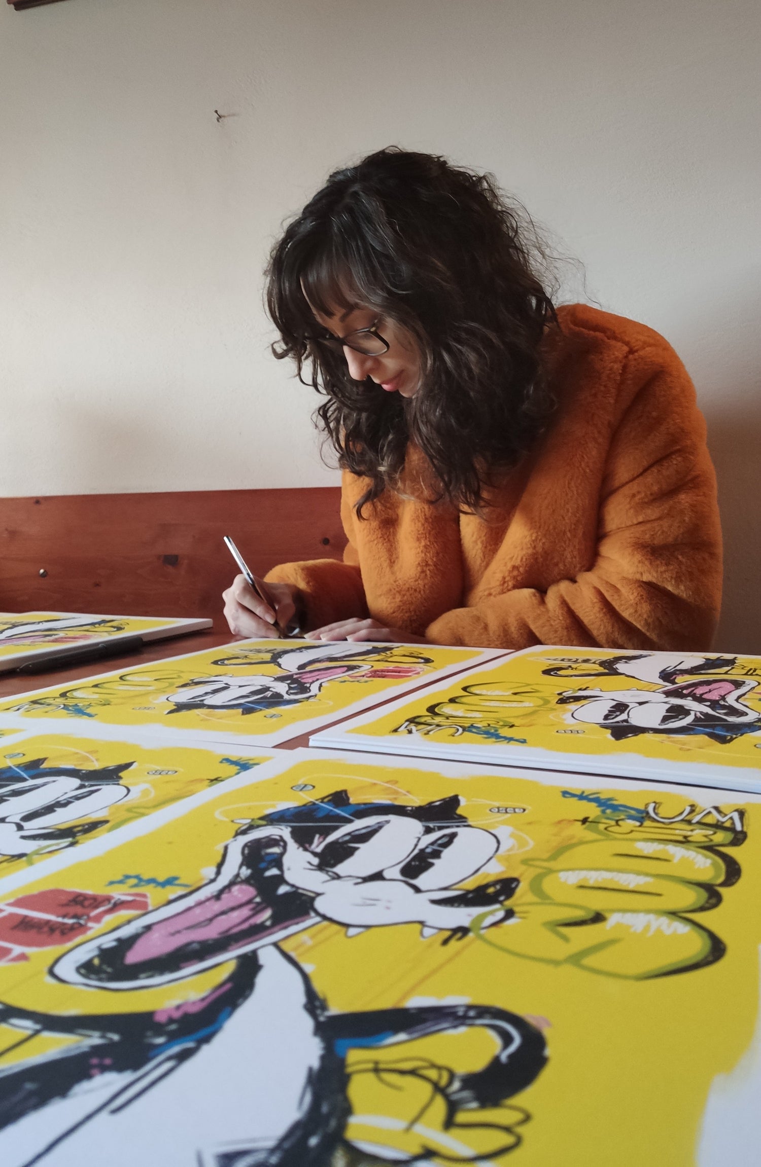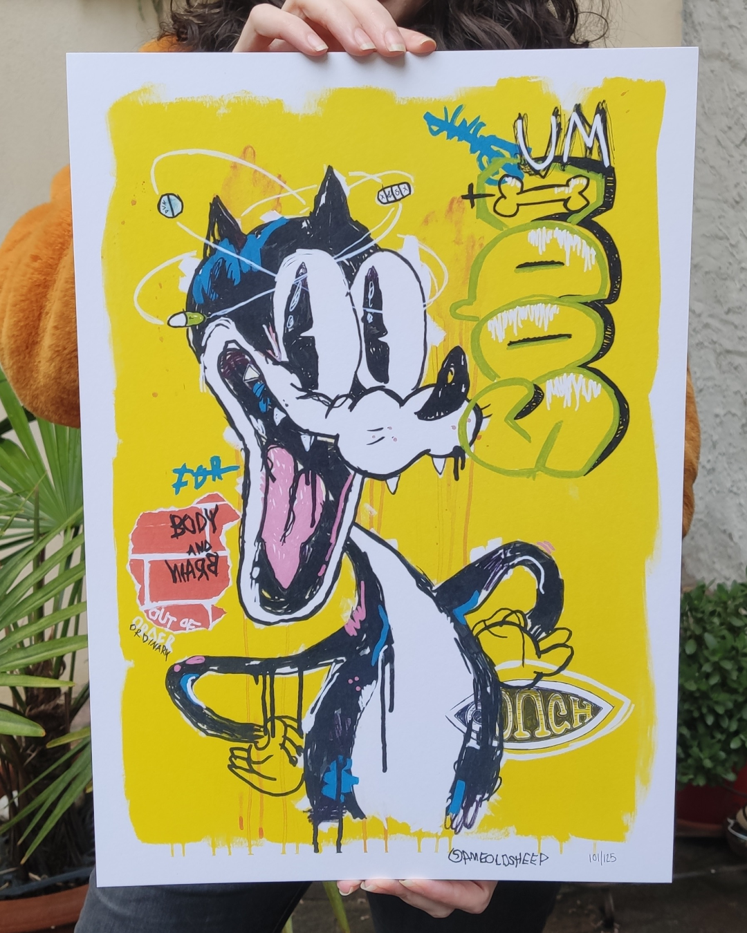 Same Old Sheep is a female Italian artist. Her universe is rich, dense, and intense, presenting an unexpected burst of color and dynamism to familiar subjects. Mixing media, integrating lettering, and playing with textures, her artwork invites a unique perspective. Same Old Sheep describes it herself as 'brutto'. From pop culture to blending and reinterpretation of old and new, experiencing Same Old Sheep's art is like putting on colored glasses and stepping through open doors into a chaotic yet relatable and inviting world. Her work inevitably draws parallels with Basquiat, sharing a similar energy and vibrancy, leaving the viewer with anything but indifference.