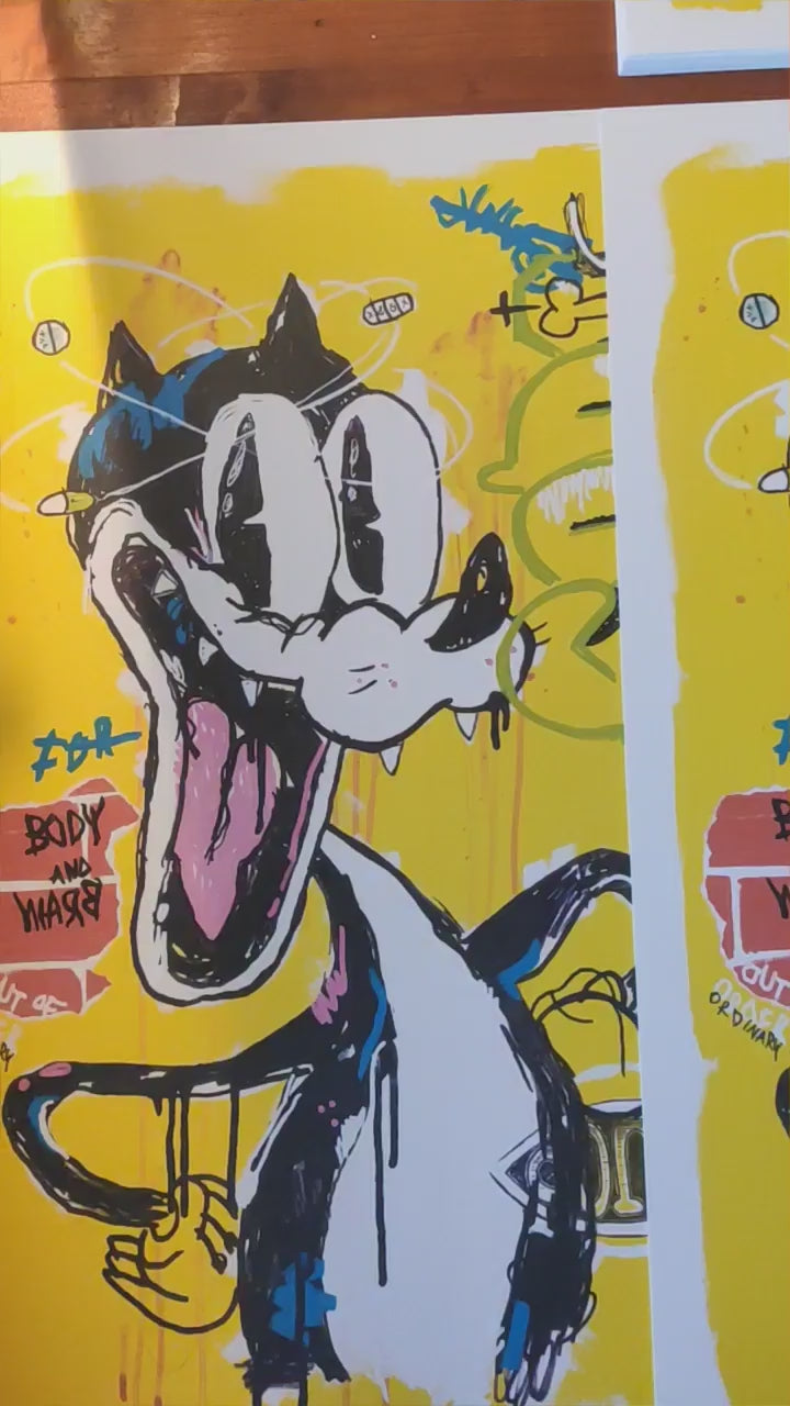 Sodium II" presents a whimsical scene with a black cartoon dog surrounded by spinning pills and a yellow background featuring brick patterns and text. Inspired by old visual advertising, Same Old Sheep explores the prevalence of pills in modern society. The artwork's playful approach invites viewers to reflect on the multifaceted role of pills, whether as a lifeline or a trap. With its timeless appeal and intricate details, "Sodium II" promises to bring joy and fascination to any interior space. We hope it captivates you as much as it does us and finds a cherished spot in your home.