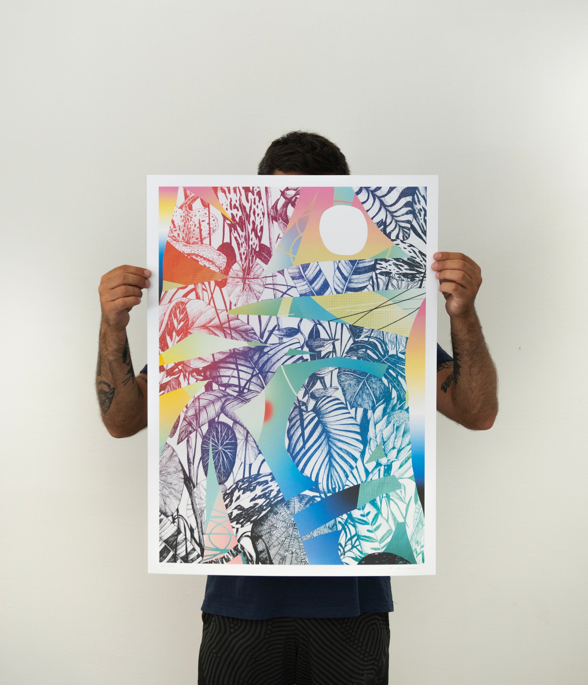 "Spring Is Coming" by Tellas captures the anticipation of spring's return, blending visions of a sunset over the sea with a tropical forest's fantasy. Dusty pink, orange, and yellow hues transition to deeper blues, reminiscent of Mediterranean sunsets. Geometric lines and patterns evoke an 80s nostalgia, modernized with soft blendings. Hand-drawn leaves showcase diverse patterns, transitioning from red to blue and green, creating an idealized tropical garden. The artwork serves as a decorative and uplifting piece, infusing a tropical vibe into any space, reminding us that better days are always on their way back."